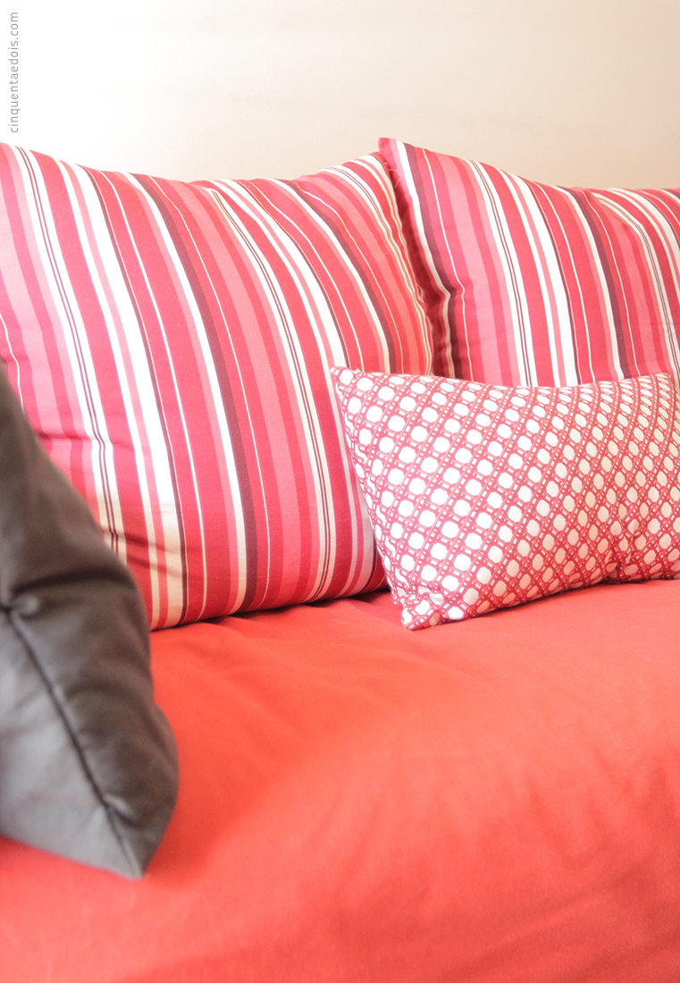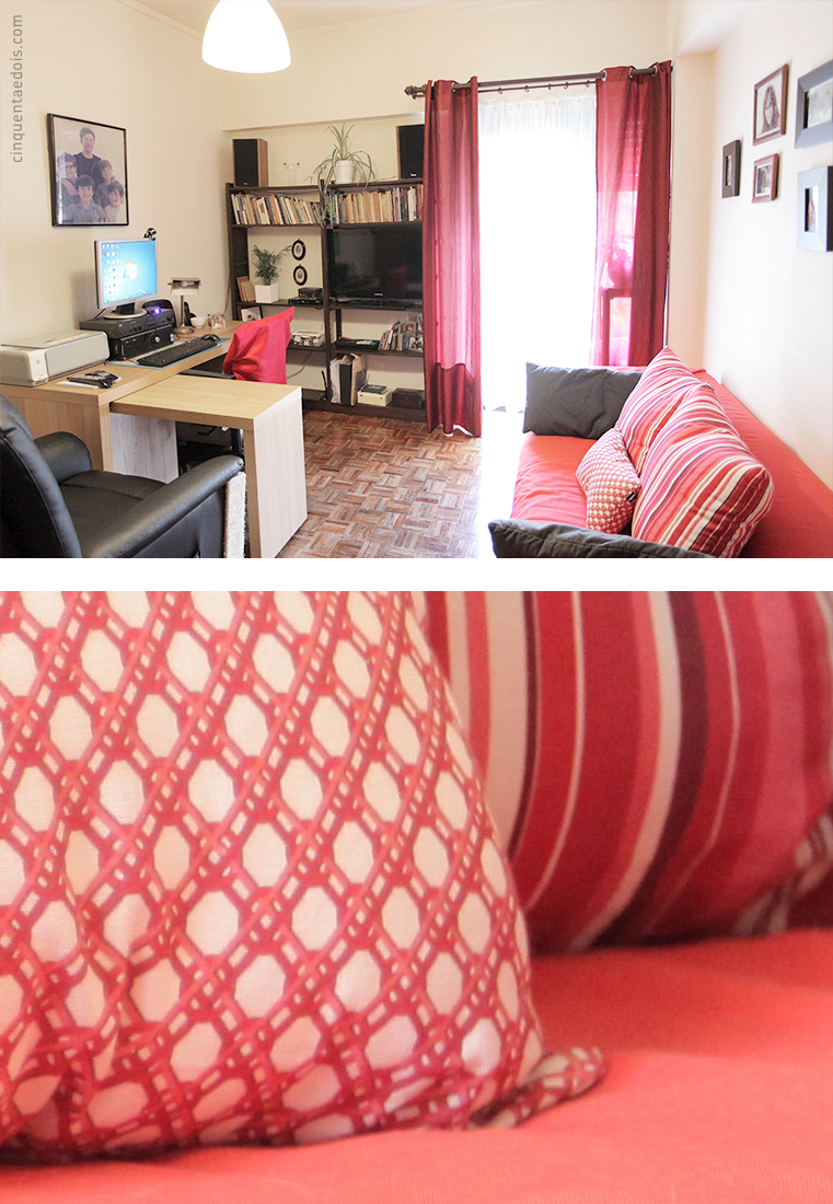 Uma sala alegre, com mais espaço, mais luz, uma energia mais positiva e menos “coisas”. Uma sala com apontamentos em vermelho, como a Helena queria. Do vermelho escuro (dos cortinados) ao vermelho vivo (do sofá) conseguimos unir todos os tons, graças às almofadas com padrões.