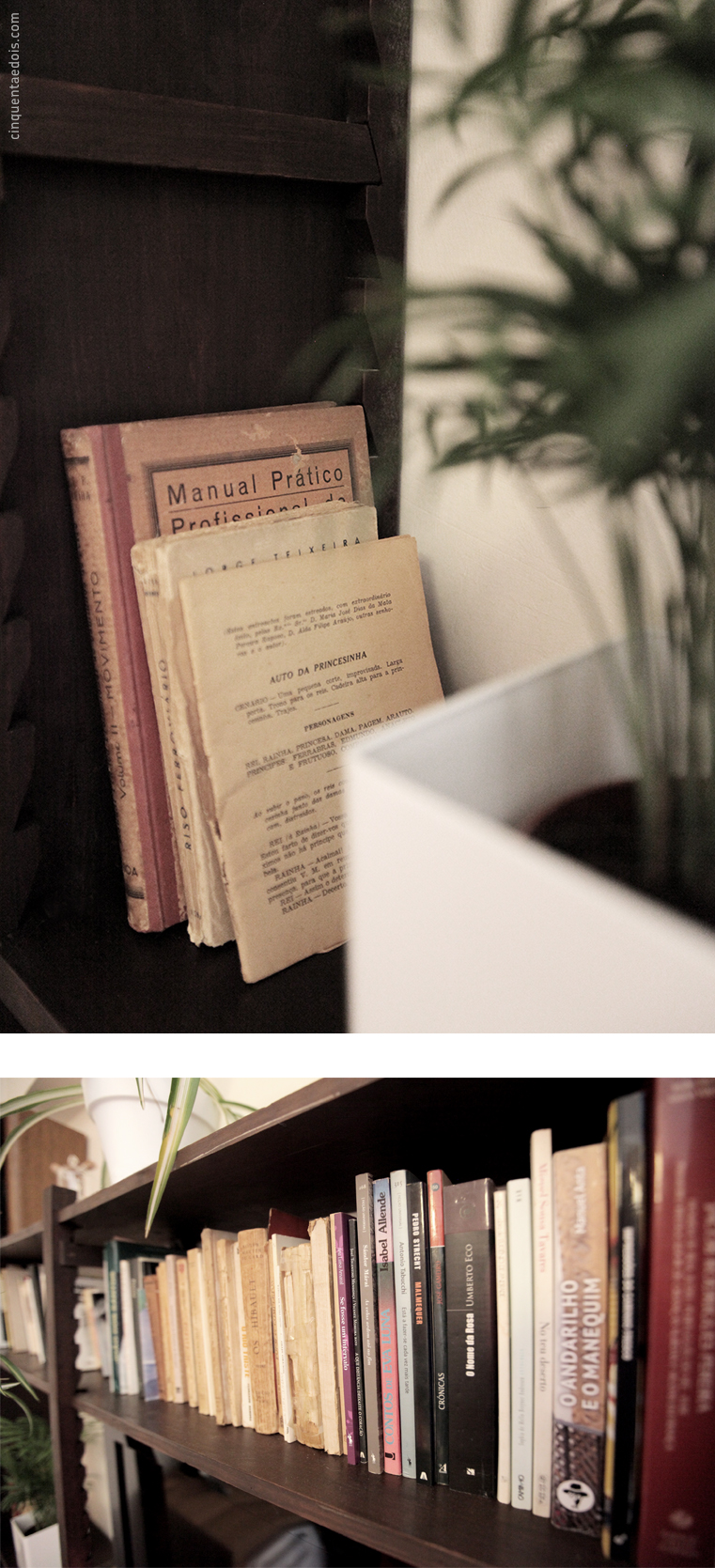 E – porque não? – os retratos dos pais colocados na parede entre duas prateleiras da estante.