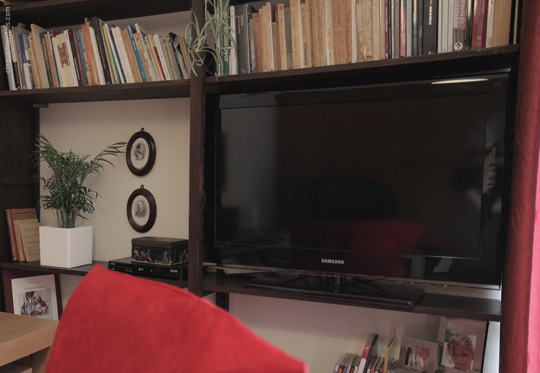 A televisão, que antes estava em cima de uma mesa de rodinhas, encaixou na “nova estante” na perfeição!