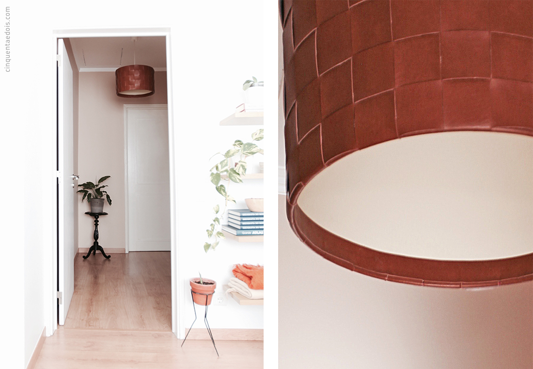 Pois é, esta casa tem tantas melhorias para fazer que o orçamento por divisão é limitadíssimo. As obras vão sendo feitas na medida das possibilidades, mês a mês. A última remodelação, um pequeno hall entre a sala, a cozinha e o escritório, coincidiu com setembro, um mês de muitas despesas – o regresso às aulas, a compra de material escolar, a inscrição em atividades,… – por isso, não havia grande margem para compras. Investimos na tinta para as paredes e teto e tudo o resto já tínhamos ou foi feito por nós. Foi o que aconteceu com o abajur vermelho que existia antes neste espaço mas que, agora, não se adequa ao estilo pretendido. Precisávamos de uma nova solução. Ainda namorámos uns quantos candeeiros… a preços variados… mas, depois de fazer contas, desistimos e resolvemos reciclar o tal abajur vermelho. E foi o melhor que fizemos pois, assim, mantivemos o estilo já criado para a sala.