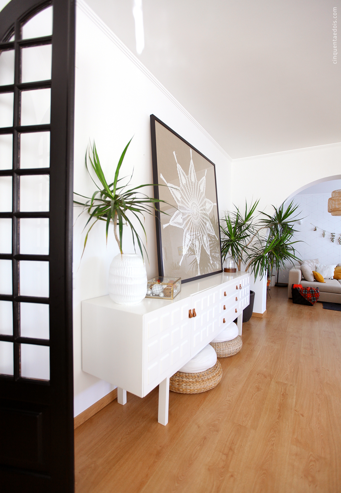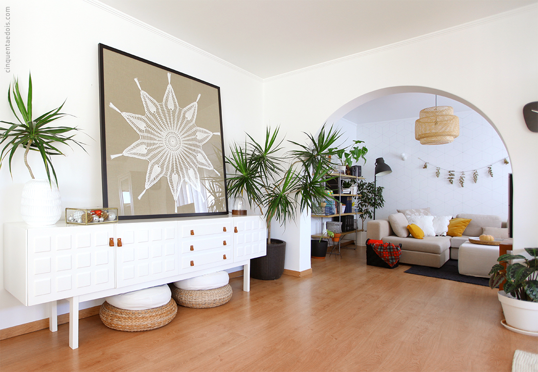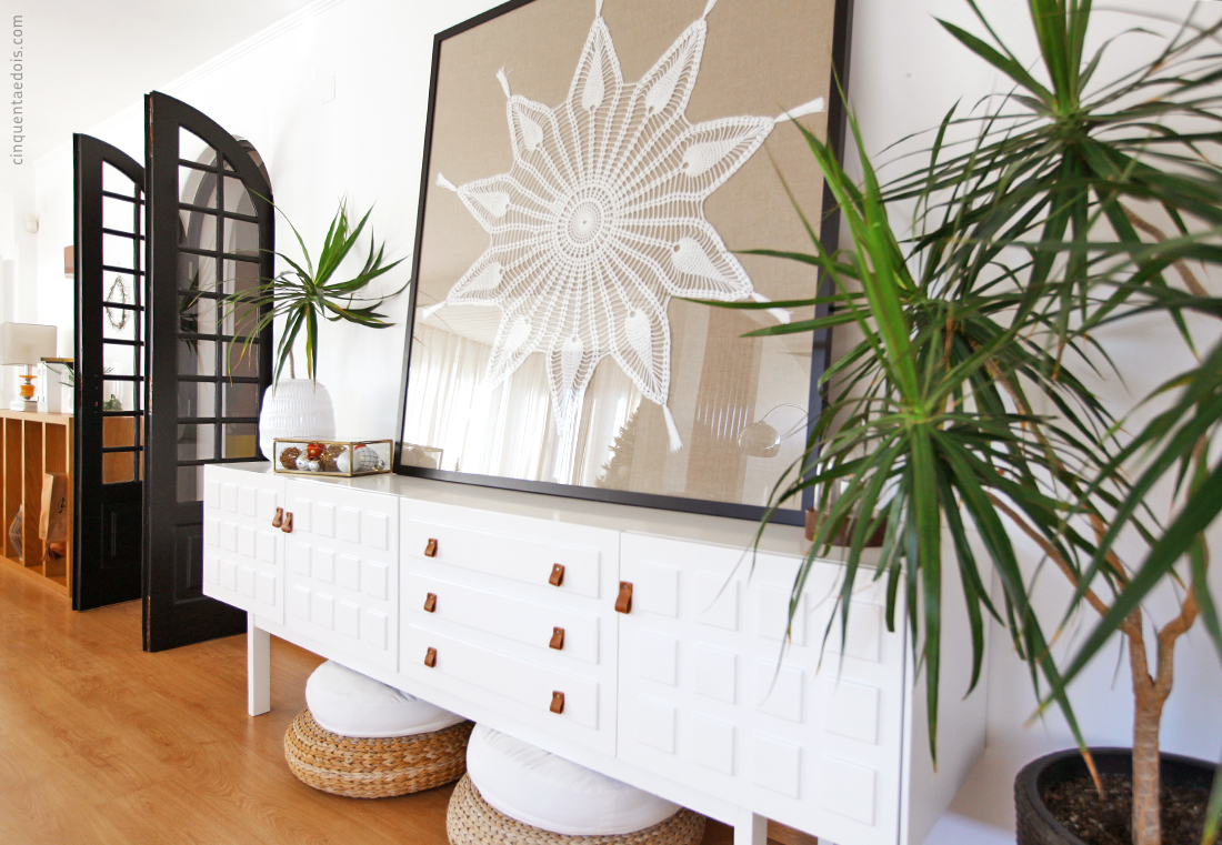 Com o fundo em linho (igual ao sofá) e caixilho preto (como a porta da nossa sala), fica perfeita neste espaço!