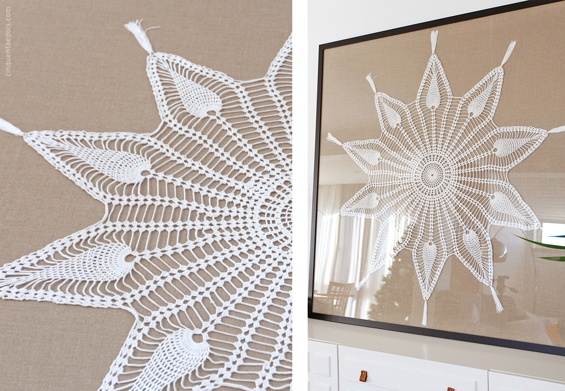 Depois das nossas almofadas com alma resolvemos atribuir a uma toalha de renda, herança de família, o estatuto de obra de arte, e emoldurá-la. A ideia inicial até era fazermos nós a moldura… até que, passa-se um dia, uma semana, um mês, dois, vários… e nunca houve tempo nem condições para concretizarmos, nós mesmo, este projeto. Por isso, acabámos por mandar fazer. Por vezes, há que assumir que não damos para tudo (e que nem sempre poupamos por sermos nós a fazer)… E foi a melhor decisão que tomámos, pois isto ia dar trabalho!