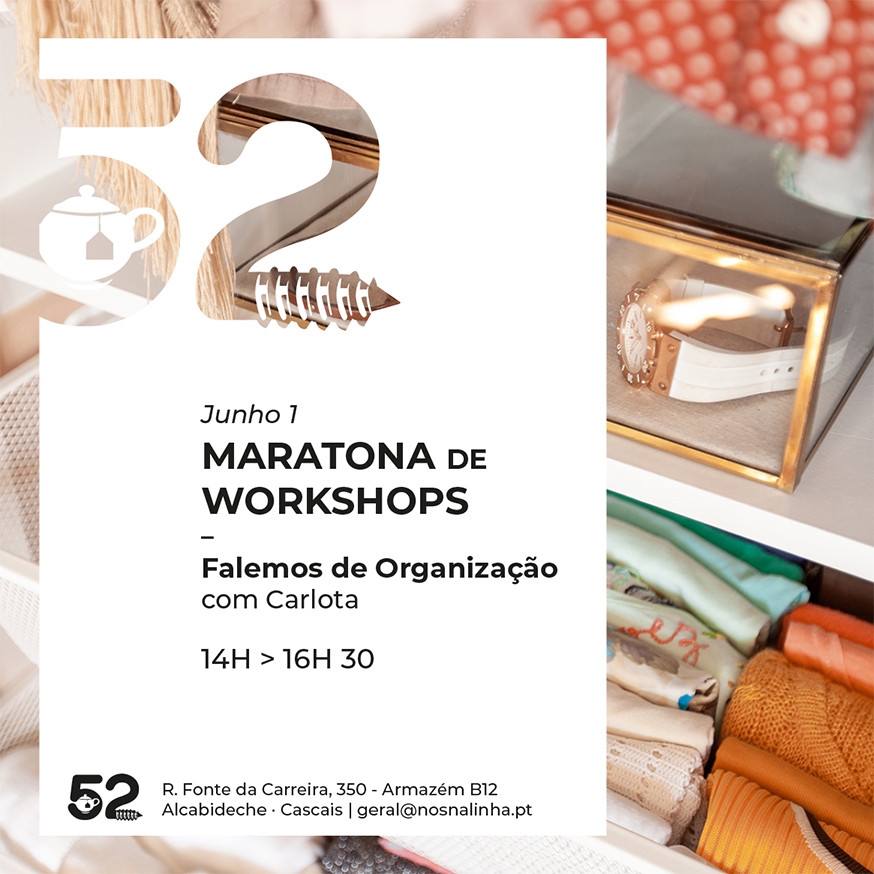 E para que o próximo dia 1 de junho seja um dia de boas conversas e muita partilha, organizámos uma Maratona de Workshops sobre os mais variados temas, com ligação ao nosso trabalho, tanto do Atelier Nósnalinha (muito ligado ao design gráfico, à escrita e à ilustração) como do 52 (diy, decoração e organização).